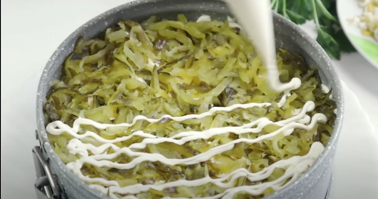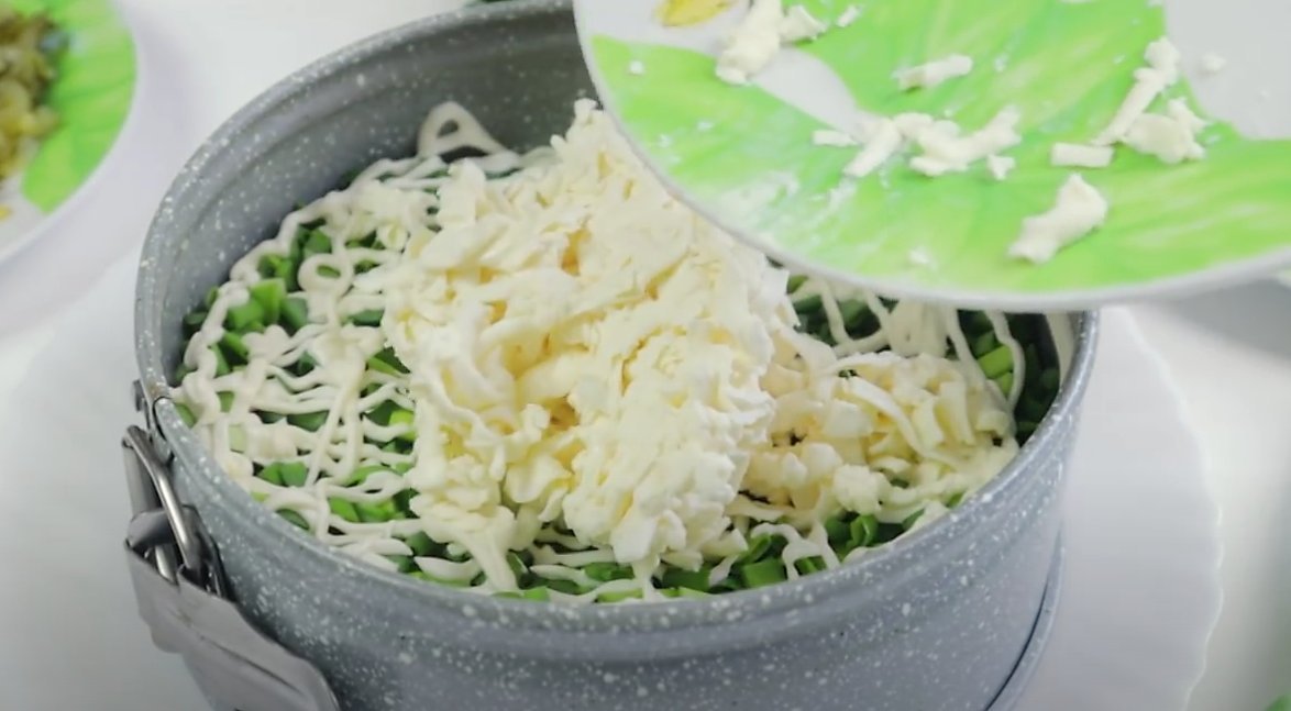 3 слой: Выкладываем слой зеленого лука и смазываем его майонезом.