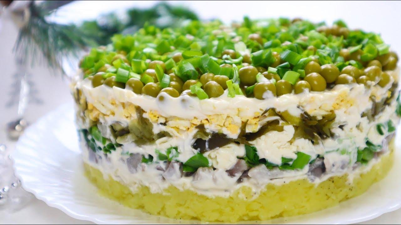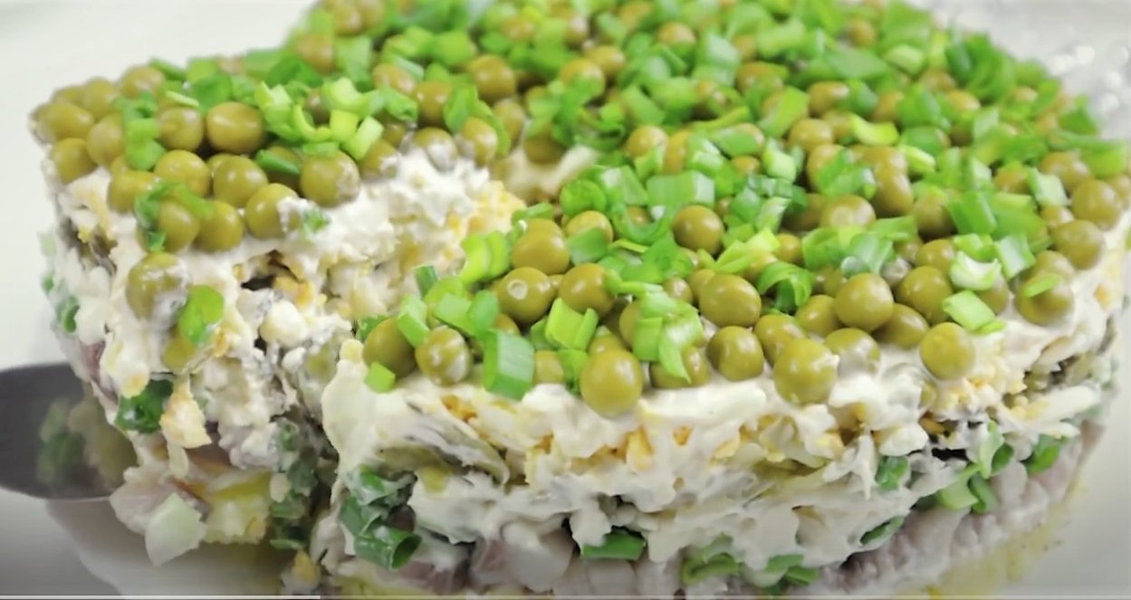 Готовый салат украшаем по вашему желанию — в данном случае уместен зеленый горошек.