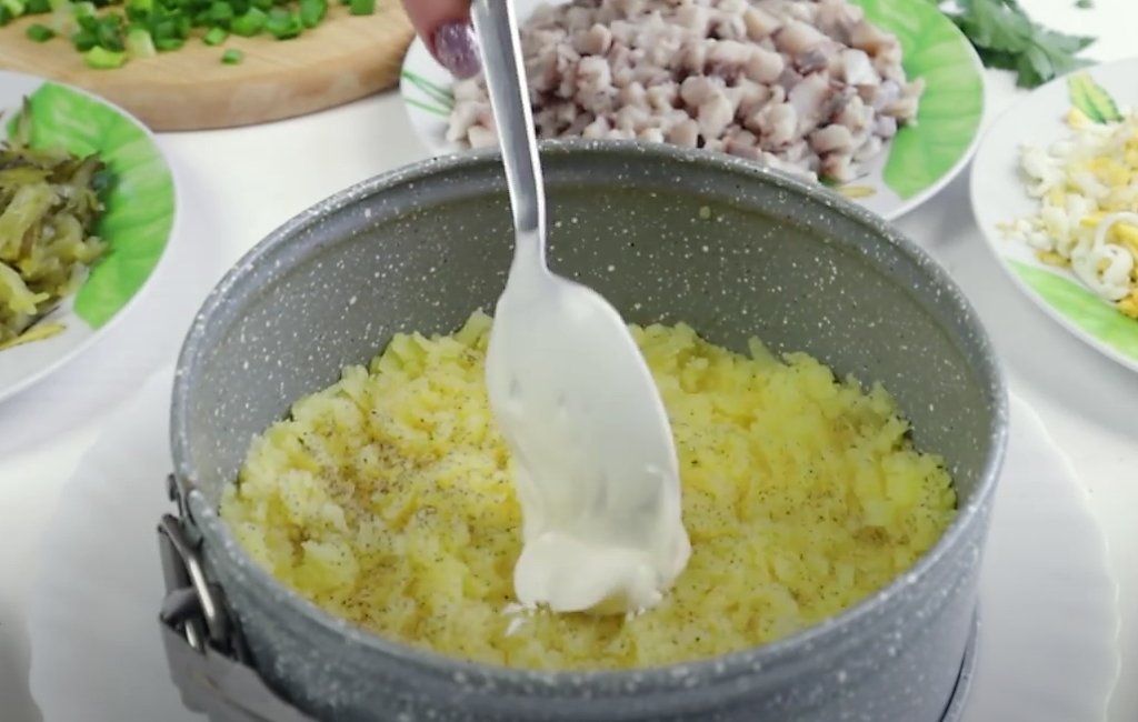 1 слой: Отварной картофель натираем на терке и выкладываем на дно кольца. Солим и перчим по вкусу. Смазываем майонезом.