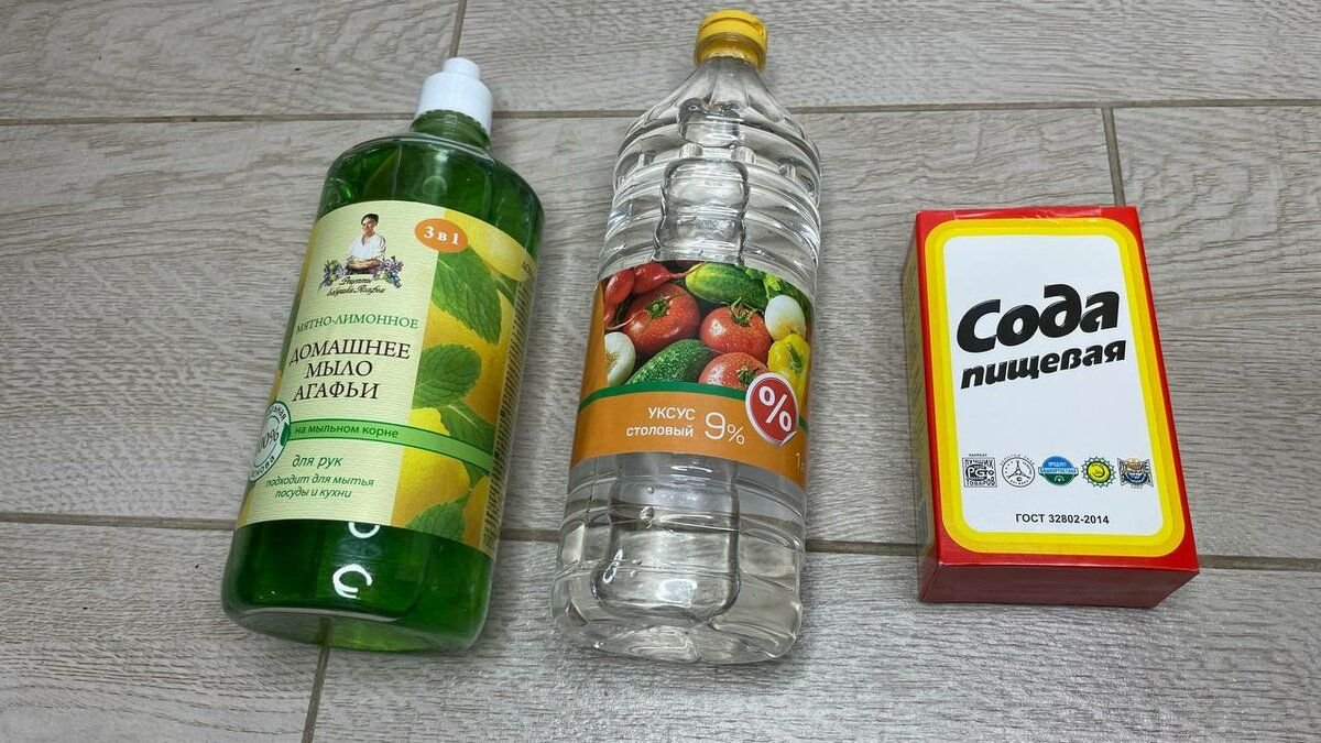Это пищевая сода, столовый 9-процентный уксус, жидкое мыло