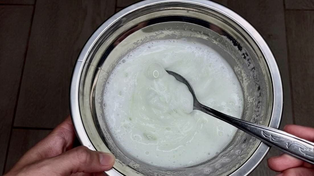 Перемешиваем соду с мылом до образования однородной смеси. В эту смесь вливаем 3 столовые ложки уксуса. Вы заметите, что начнётся реакция – сода будет шипеть. Так и должно быть.