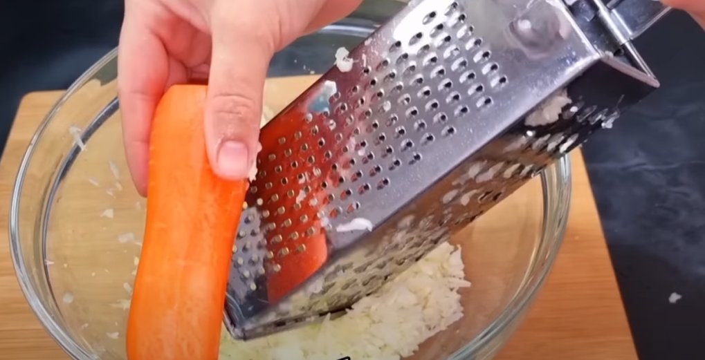 1) Белокочанную капусту натереть на крупной терке. Далее натереть репчатый лук – его тоже на крупной терке. Затем крупную морковь натереть, но на этот раз – на мелкой терке.