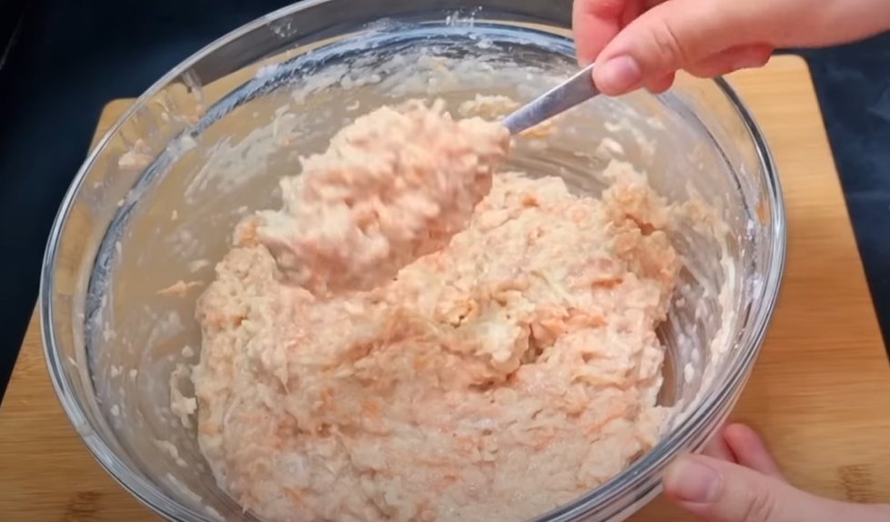 2) К тертой овощной соломке добавить куриный фарш и залить всю эту смесь примерно стаканом кефира.