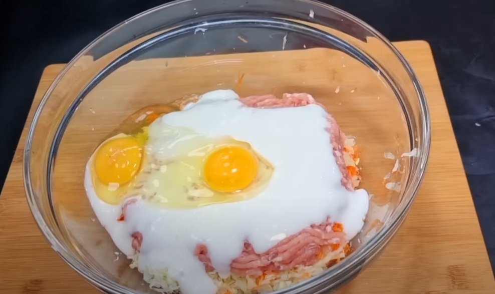 3) Сюда же добавить 2 сырых яйца целиком, а также соль и перец по вкусу.