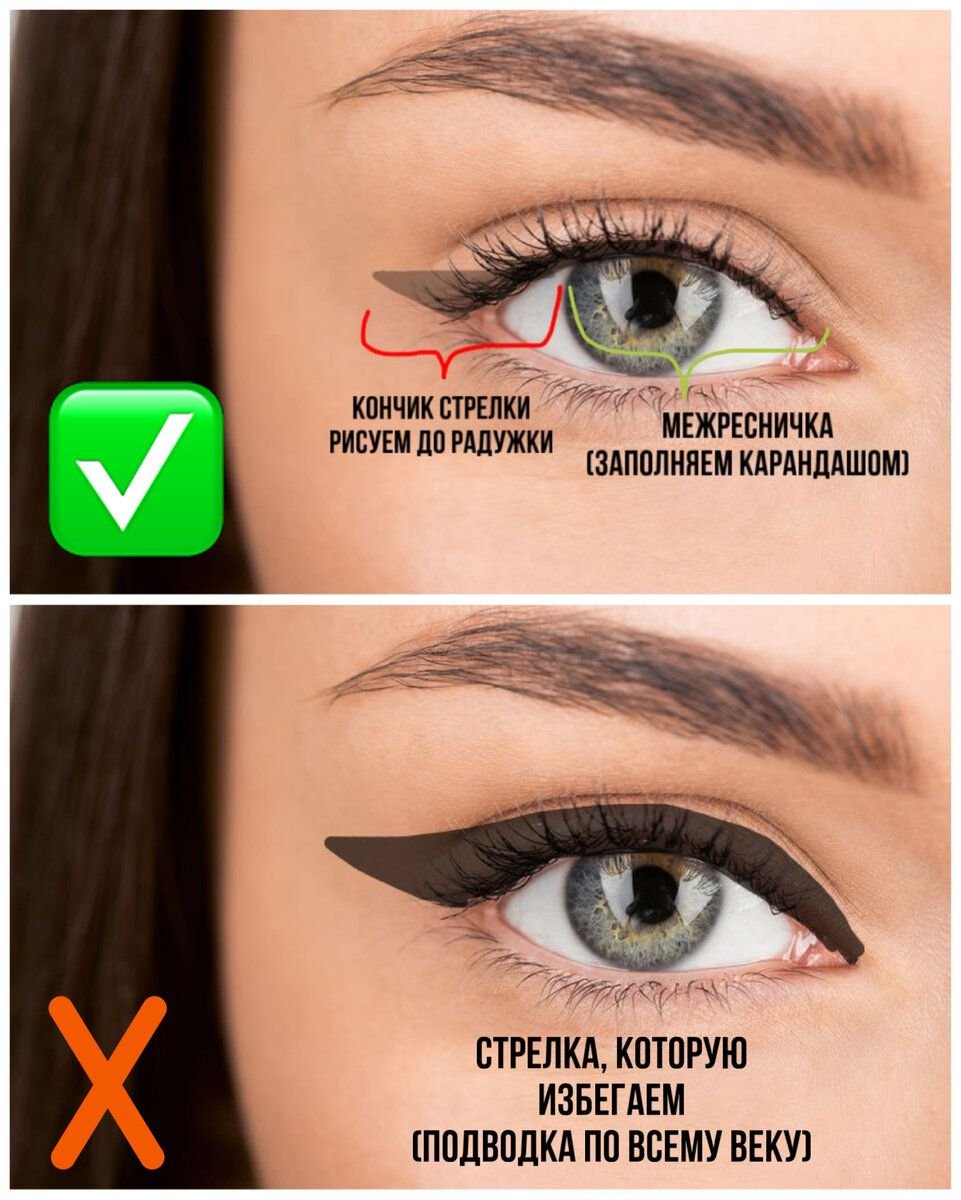Большая длинная жирнющая классическая стрелка, которая начинается от начала глаза ( возле слезного канала) и пересекает все веко режет глаз и делает его еще более тяжелым и нависшим. Это, пожалуй, самая распространенная ошибка.