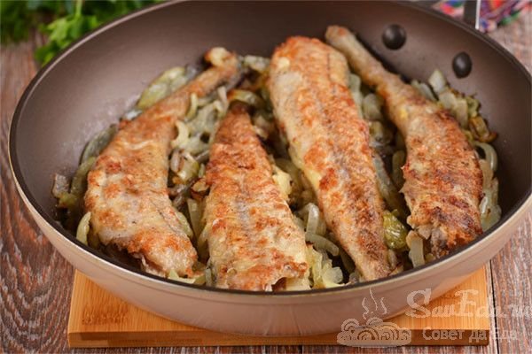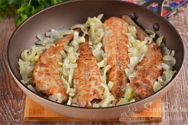 8. Добавляем между тушек минтая почти готовый лук и продолжаем жарить еще 5 минут. Лук немного помешиваем. Если лук добавить сразу в начале обжаривания рыбы, то к концу приготовления он подгорит и добавит блюду неприятный вкус.