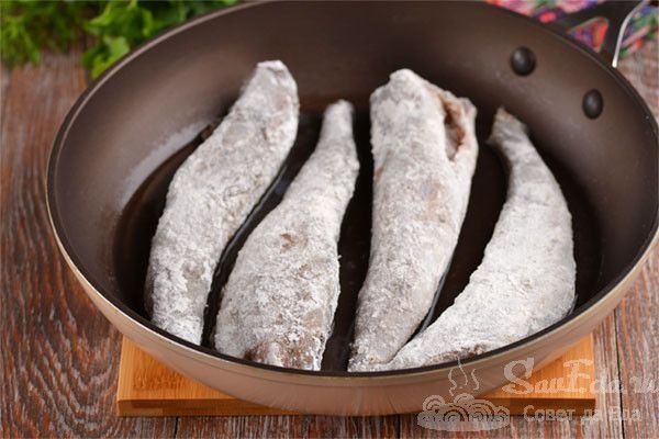 6. Куски рыбы очищаем от тимьяна, обваливаем в муке и отправляем в ароматное масло после лука. Сковороду немного прикрываем и жарим на высокой температуре около 10 минут.