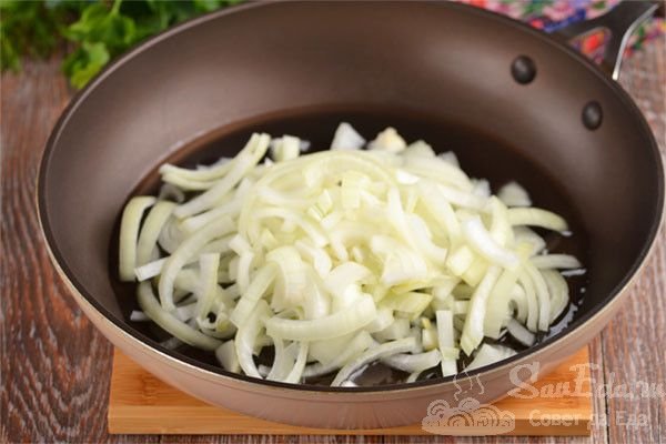 4. Пока маринуется минтай, лук разрезаем на 4 части, нарезаем соломкой и отправляем в масло в сковороду. Жарим на средней температуре около 5 минут.