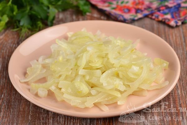 5. Лук не должен полностью приготовиться, только поменять цвет. Прижимаем его в сковороде лопаточкой, чтобы удалить масло, и перекладываем на тарелку.