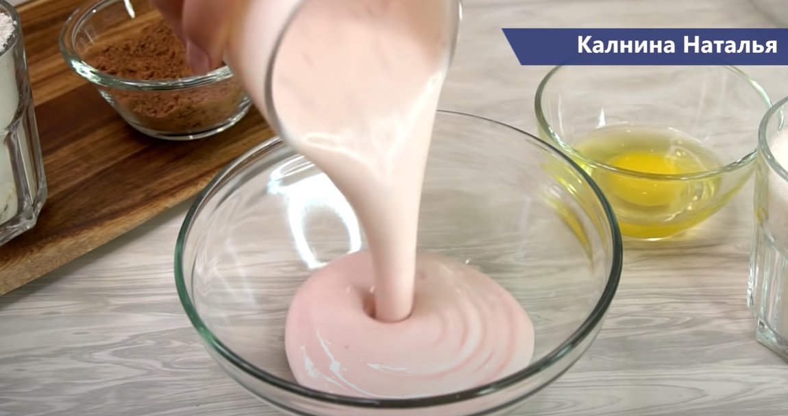В другую миску разбиваем 1 яйцо, добавляем стакан сахара, щепотку соли и перемешиваем, теперь вливаем кефир и еще раз перемешиваем. Добавляем 1 стакан муки и 2 т.л. какао порошка.