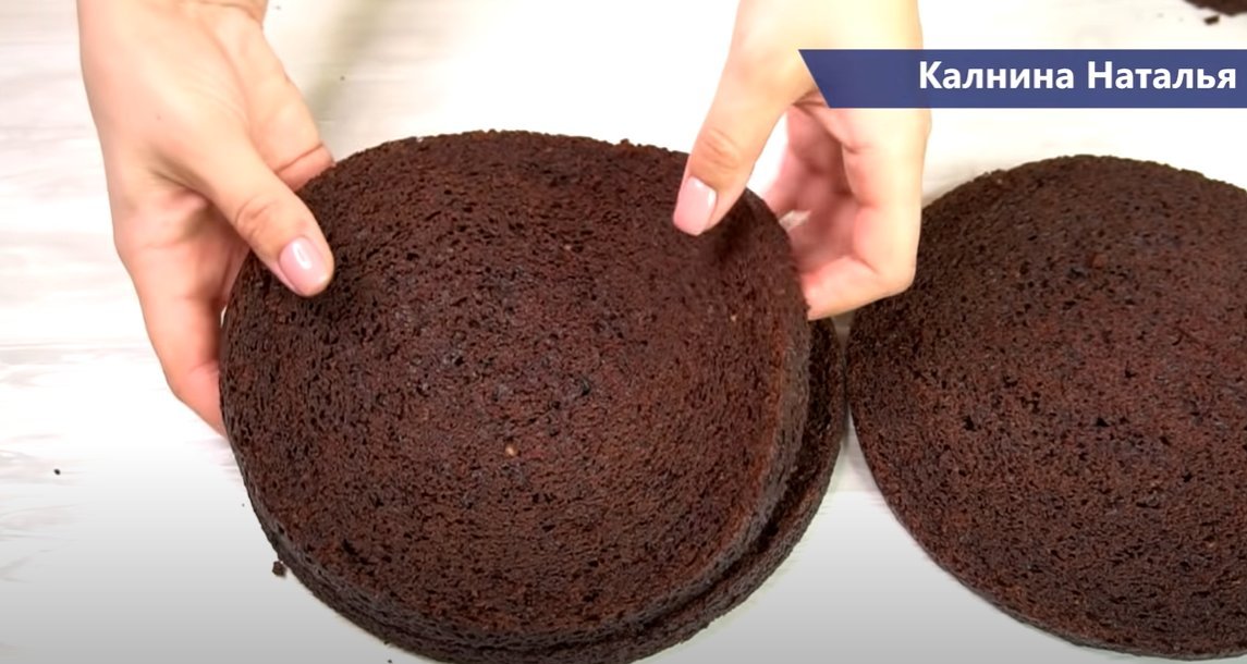Срезаем неровности и делим корж на 3 корж, сначала делаем надрезы ножом, затем режем при помощи нитки.
