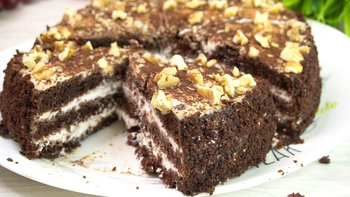 обрезки измельчаем блендером и посыпаем бока тортика, верх посыпаю какао порошком и рубленными орешками. Даем тортику немного пропитаться и можно разрезать и подавать к чаю.