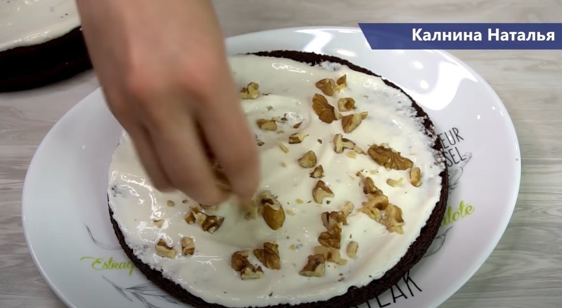 Собираем торт, смазываем кремом первый корж, затем торой корж, первый корж посыпаем порубленными орешками по желанию, у меня грецкие орехи, предварительно обжаренные на сковороде.