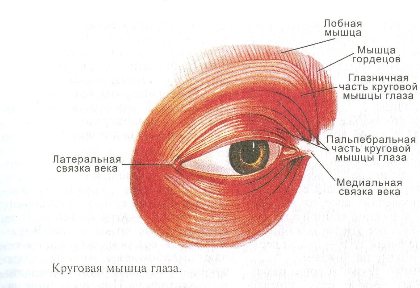 Также еще одна особенность круговой мышцы глаз — это её большая связь с кожей век. Поэтому, напрягаясь, мышца постепенно начинает сжиматься, стягивая за собой кожу к которой она прикреплена. Поэтому, чем больше сжата мышца — тем меньше глаза и тем глубже морщинки вокруг глаз.