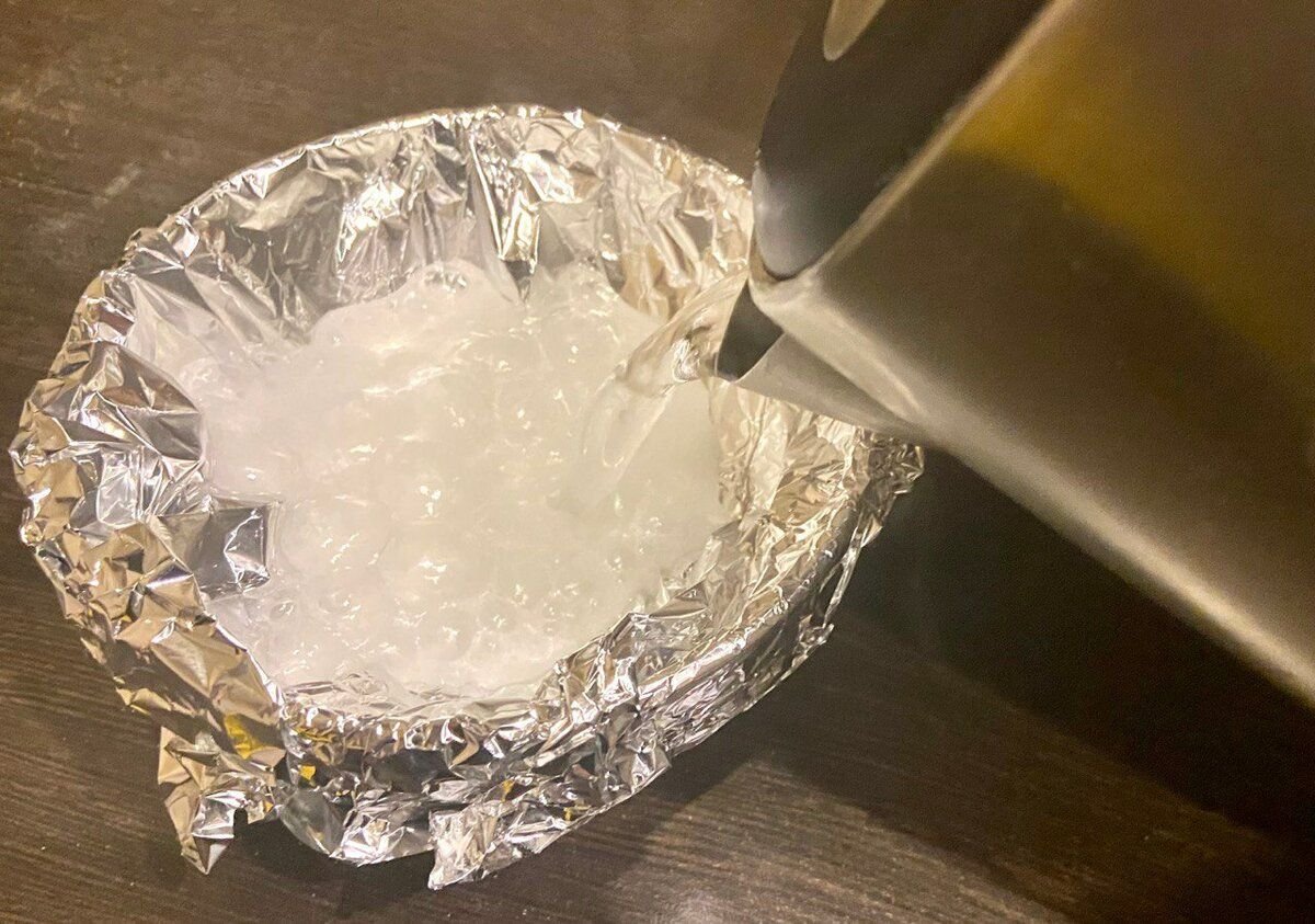 6. Заливаем крутым кипятком и помещаем серебряное изделие в бурлящую смесь