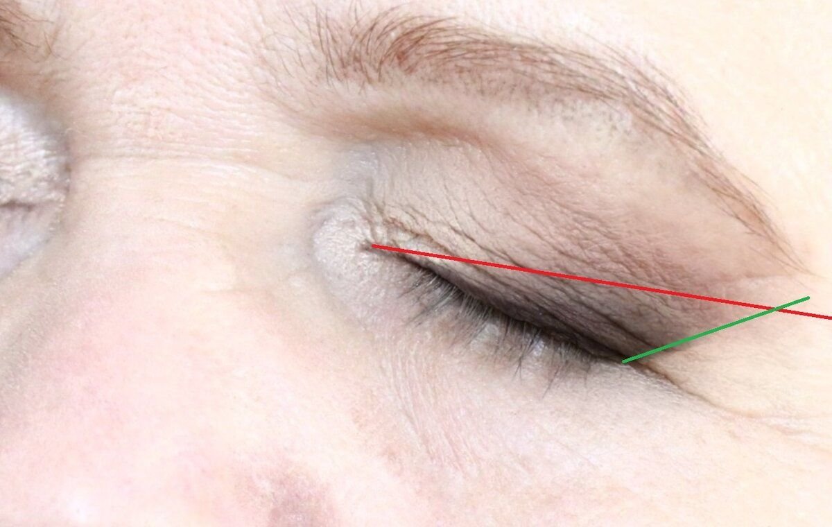 До куда можно выводить тени у внешнего уголка глаза? Визуально от внутреннего уголка глаза проведите горизонтальную линию (у меня немного на фото горизонт завален, на самом деле он у меня идет по брови. На фото эту линию я показала красным), затем проведите линию, которая как бы продолжает нижнее веко глаза при открытом глазе (зеленая линия на фото). И вот где эти две линии пересеклись — до этого места и доводим растушевку у внешней части глаза.
